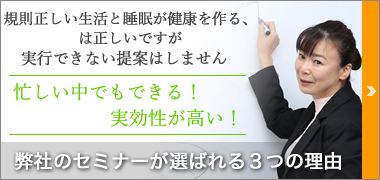 規則正しい生活と睡眠が健康づくりに大事なのは確かですが、目標値や納期がある職場ではなかなか実行できません。忙しい中でもできる!ハードな職場でも取り組める、実効性の高い方法をご提案しています。