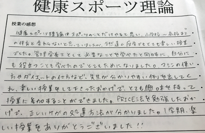 学校法人 食糧学院の管理栄養士4年生課程での、私が担当している「健康スポーツ理論」の前期試験が昨日ようやく修了しました。